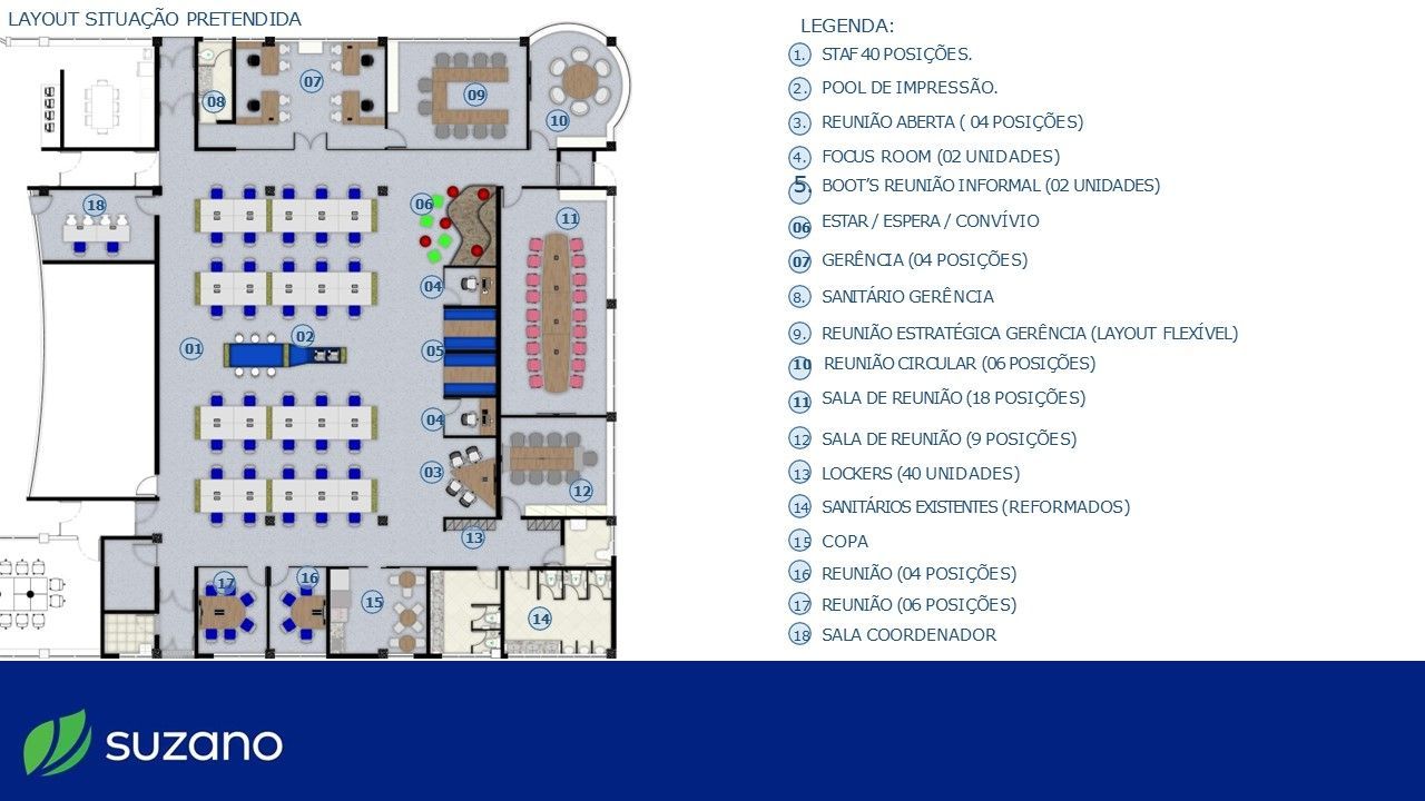 Adaptação do layout da parte administrativa do prédio do SDCD ao conceito Juntos & Misturados na unidade de Três Lagoas - MS, da Suzano S.A.
