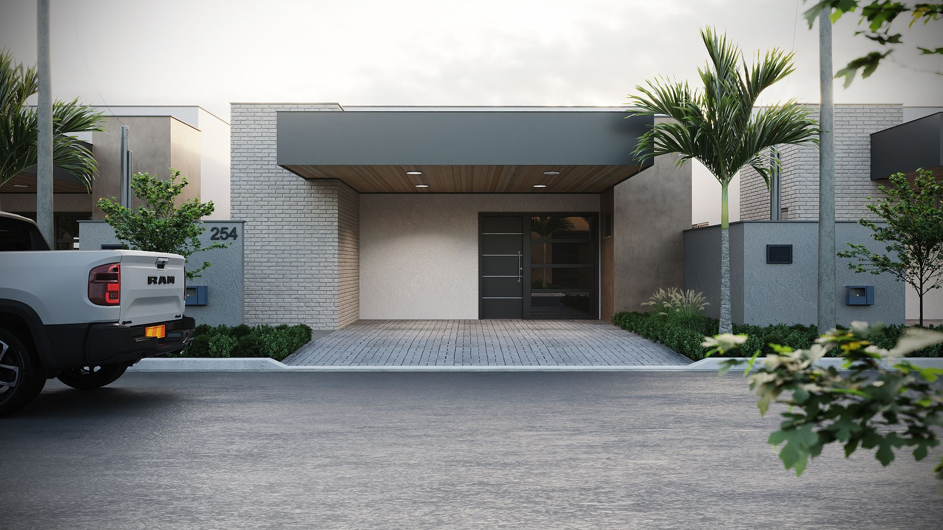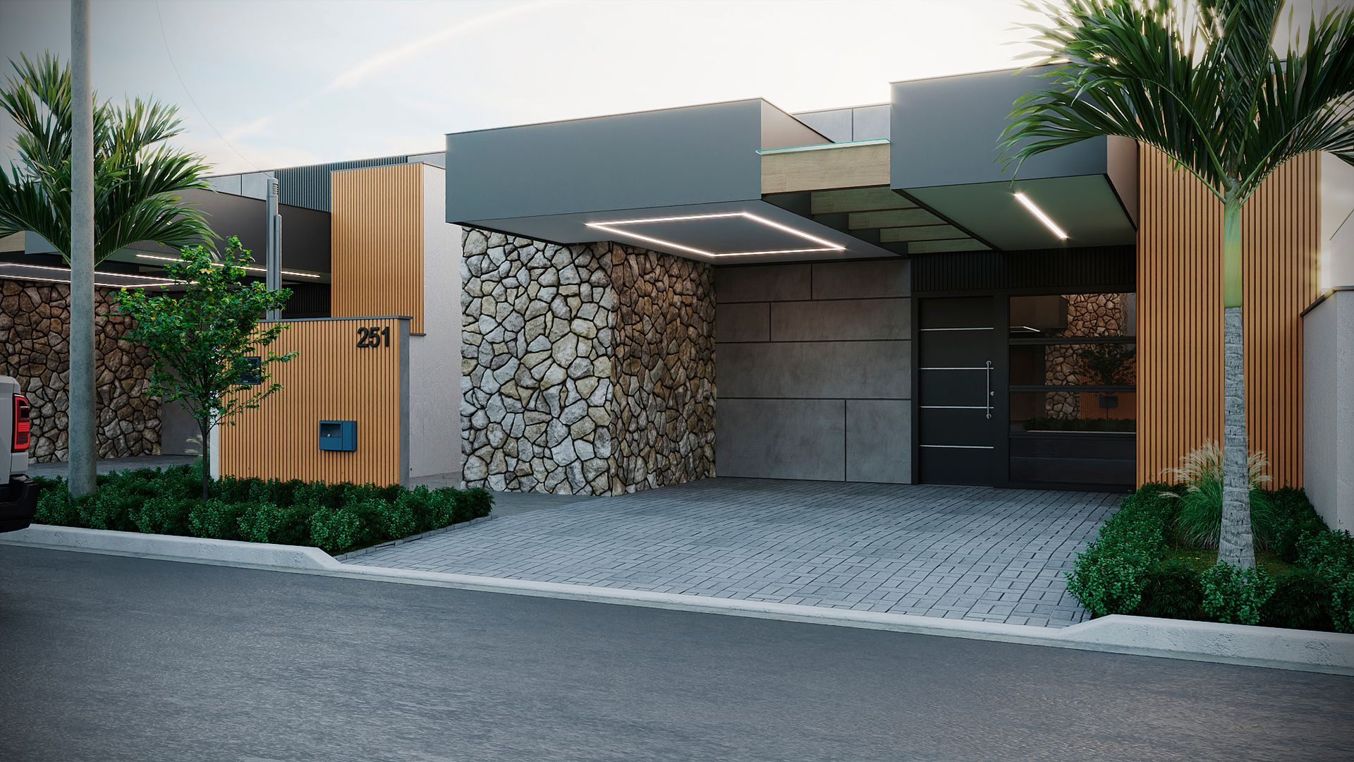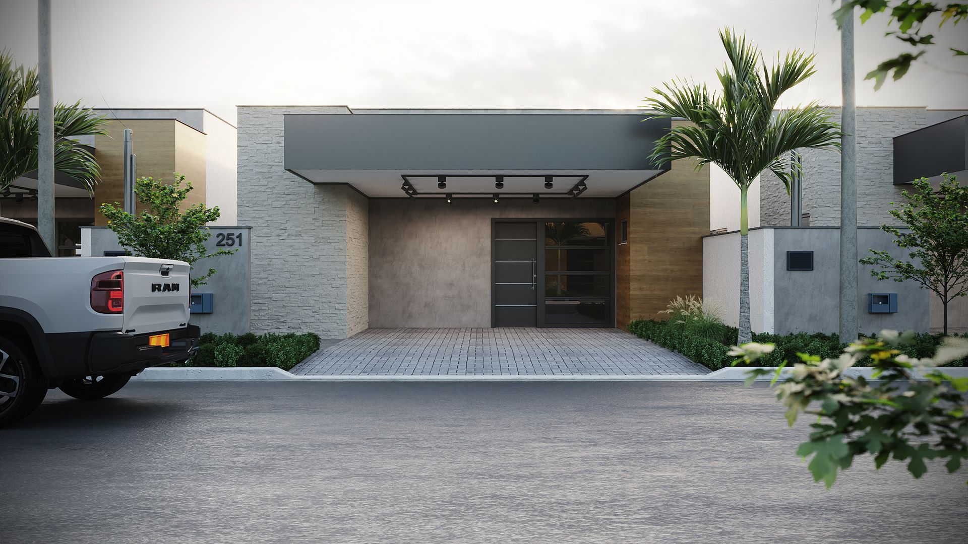 Projeto de Arquitetura para padronização de fachada residencial, contemplando definição de revestimentos em geral e elementos arquitetônicos. Com 03 opções de estudo preliminar, cada qual com sua respectiva estimativa de custo, sendo elas: