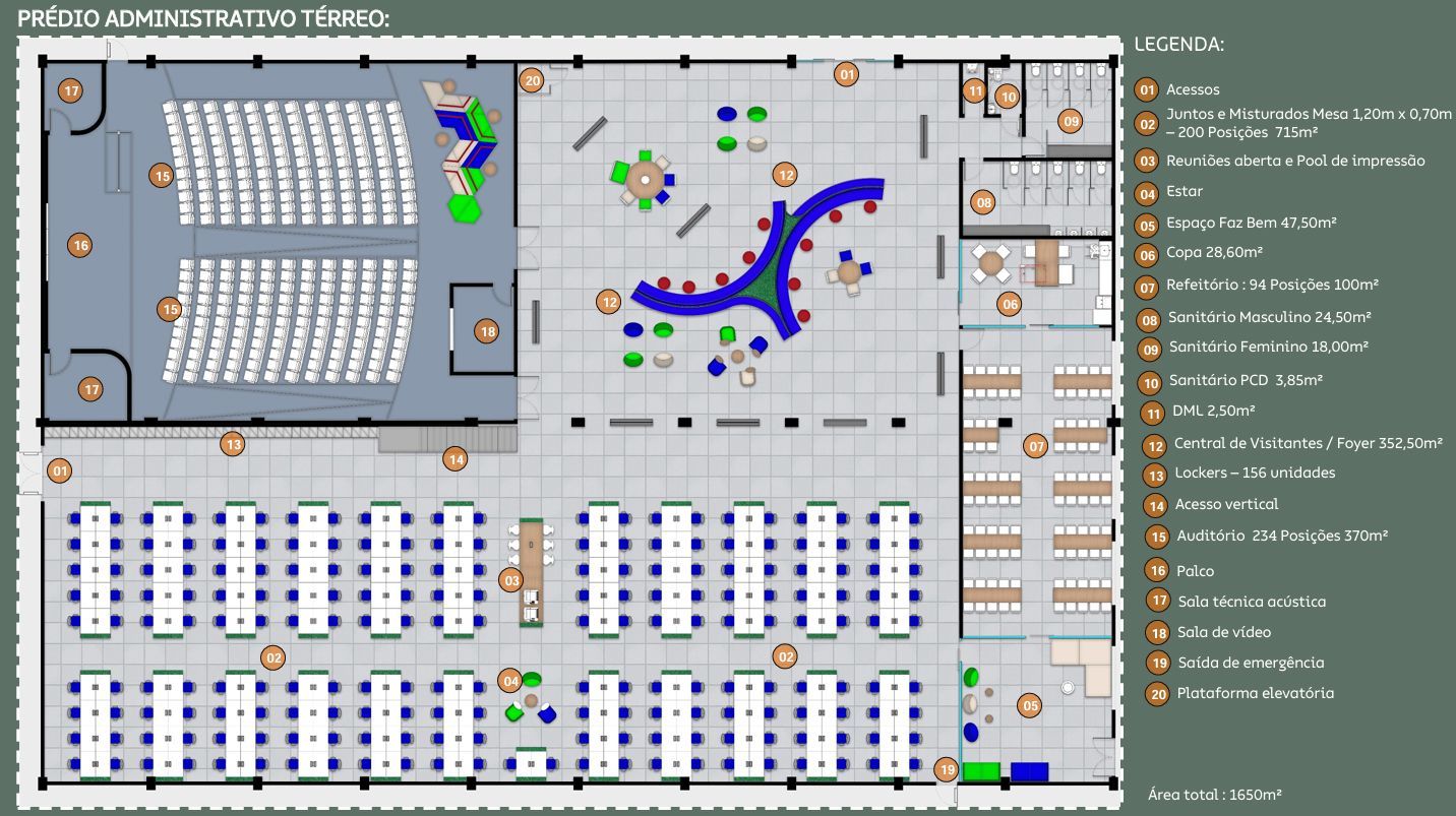 O projeto contempla a ampliação da unidade com a integração da área atual de 37.000 m² ao novo terreno adquirido de 39.900 m², totalizando cerca de 76.900 m². A proposta organiza o espaço de forma funcional, aproveitando as construções existentes e planejando acessos, estacionamentos, áreas verdes, circulações e edifícios de diferentes usos. O objetivo é garantir a expansão da unidade dentro da legislação vigente, promovendo eficiência, sustentabilidade e integração dos ambientes.
