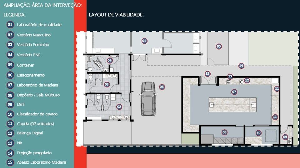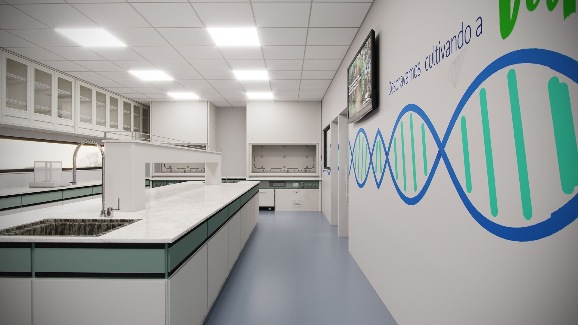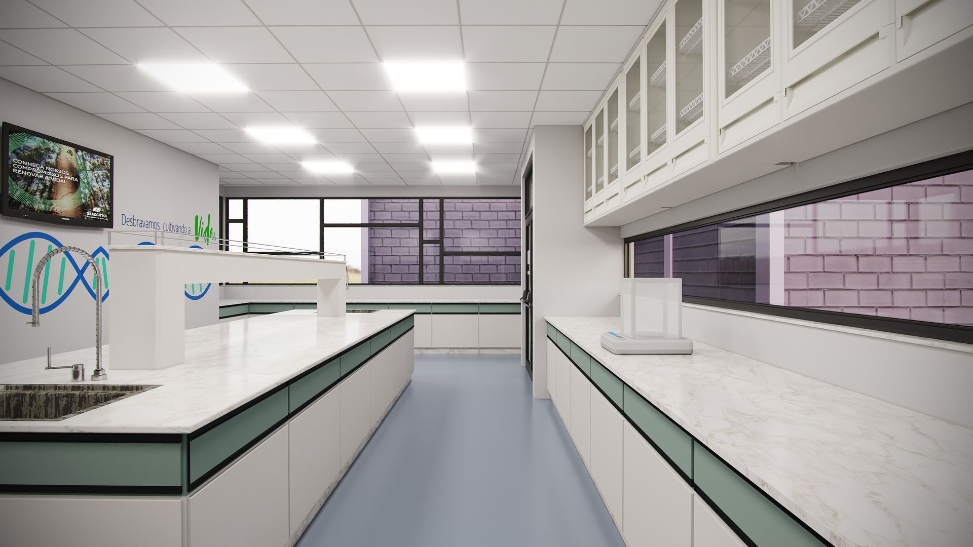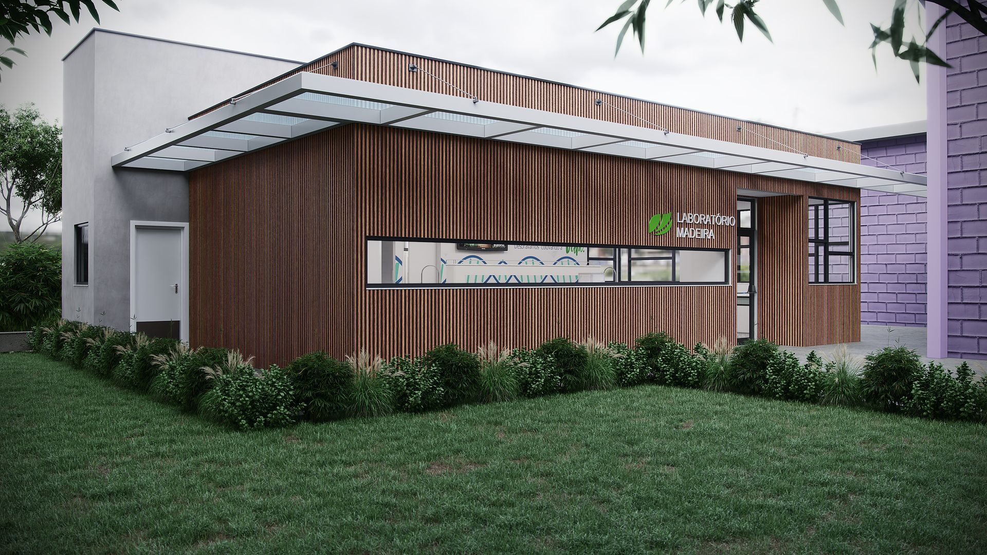Projeto para Laboratório de Madeira, anexo ao laboratório de qualidade, com o intuito de acomodar 02 autoclaves de 50 litros cada, uma 01 coifa, balança digital, bancadas, aparelho Nir, prateleiras e armários, no conceito Juntos & Misturados Suzano. Somando uma área de aproximadamente 105m² de projeto.