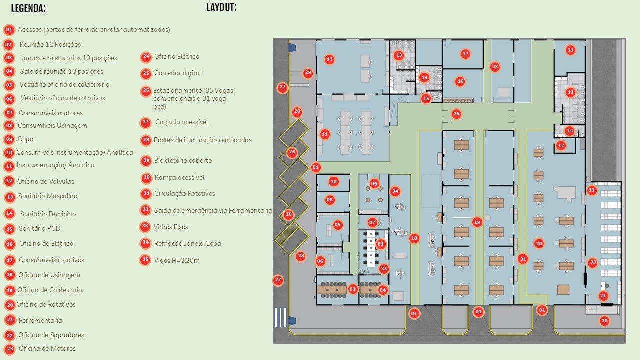 Projeto Arquitetônico para revitalização, ampliação e unificação das Oficinas de Manutenção: Caldeiraria, Rotativos e Usinagem. No conceito, “Juntos e Misturados Suzano”. Somando uma área de aproximadamente 1280m².