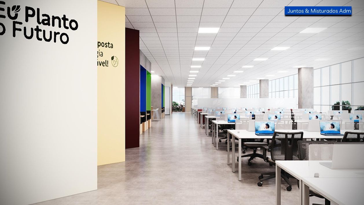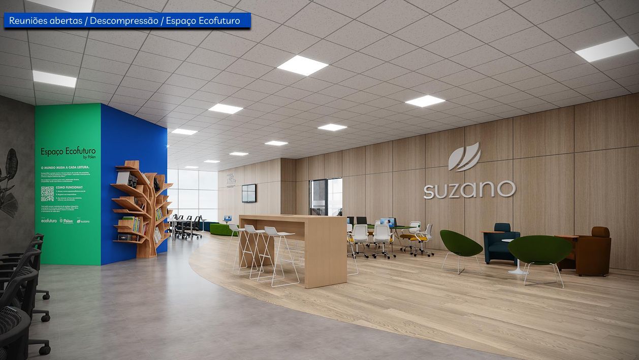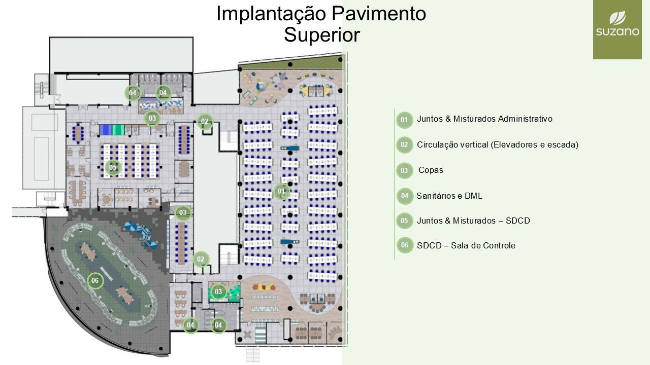 Projeto de Arquitetura de interiores no conceito “Juntos e Misturados” Suzano. Para o prédio administrativo, situado na nova Fábrica da Suzano, em Ribas do Rio Pardo –Projeto Cerrado. Tendo no pavimento Térreo –Recepção e áreas de laboratório. E no 1º pavimento espaços administrativos, juntamente com sala de controle e monitoramento “SDCD”.
