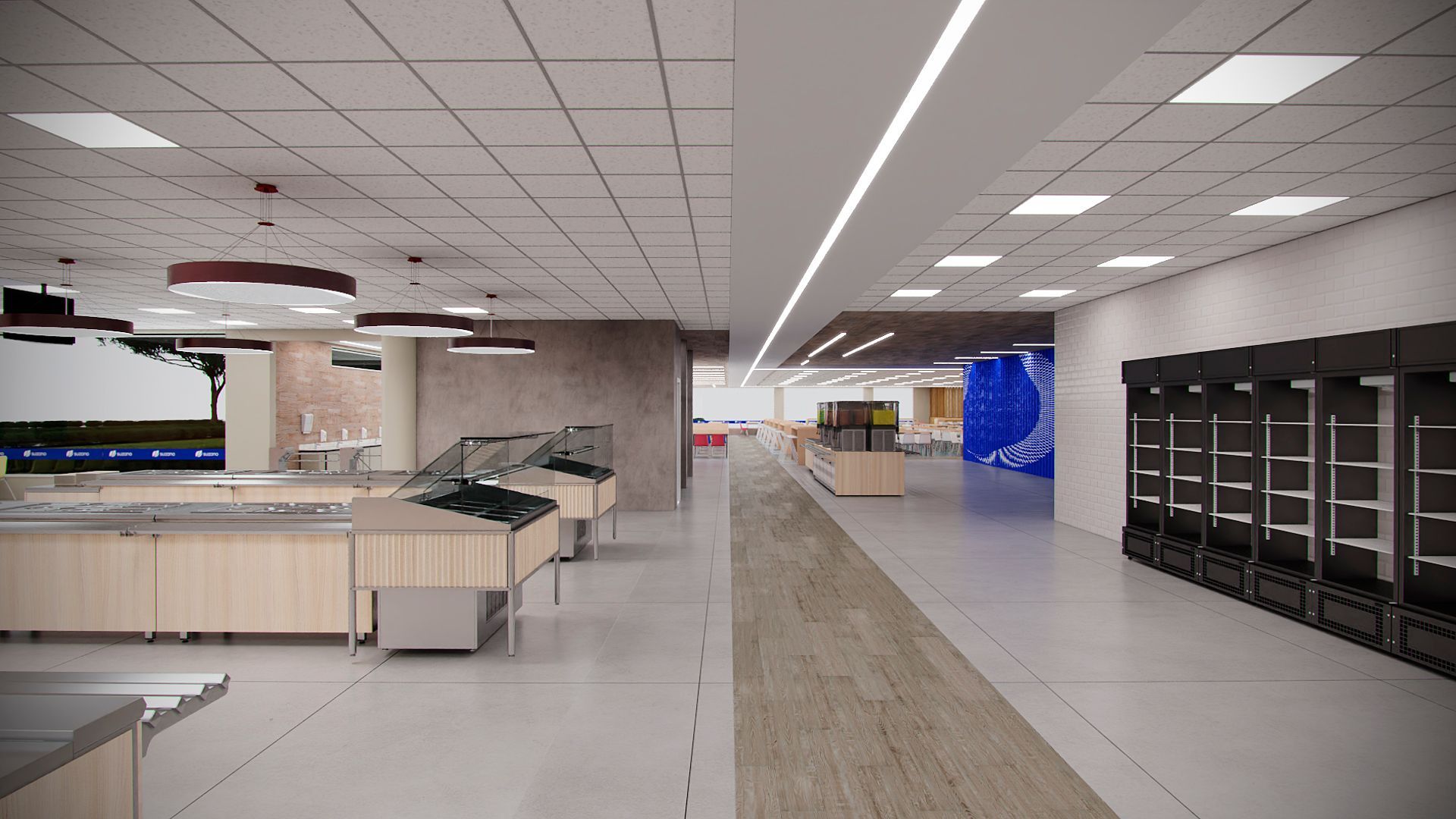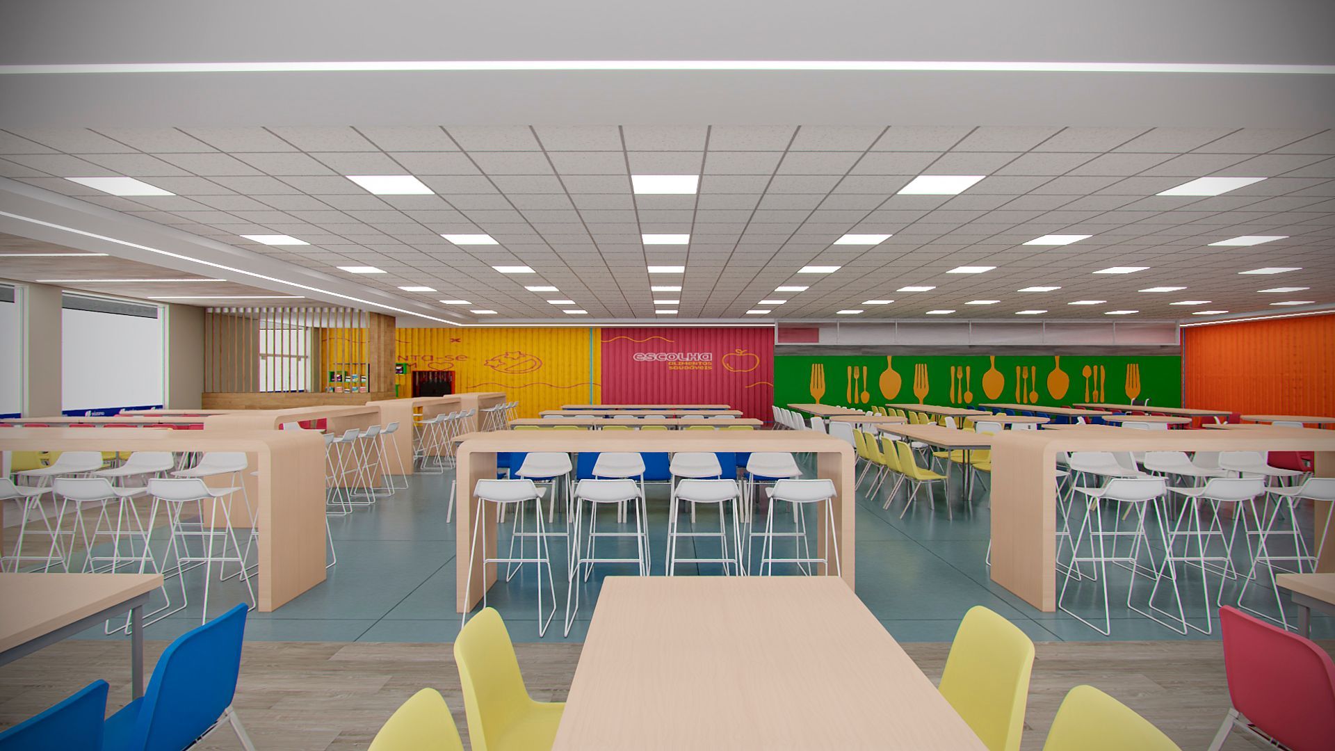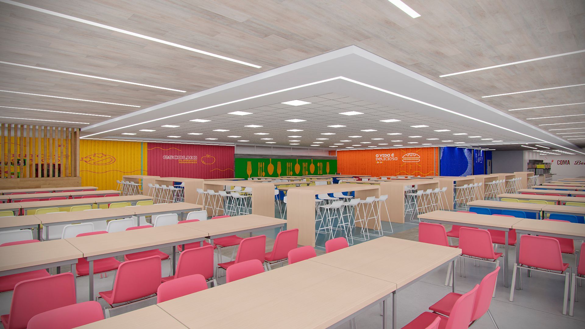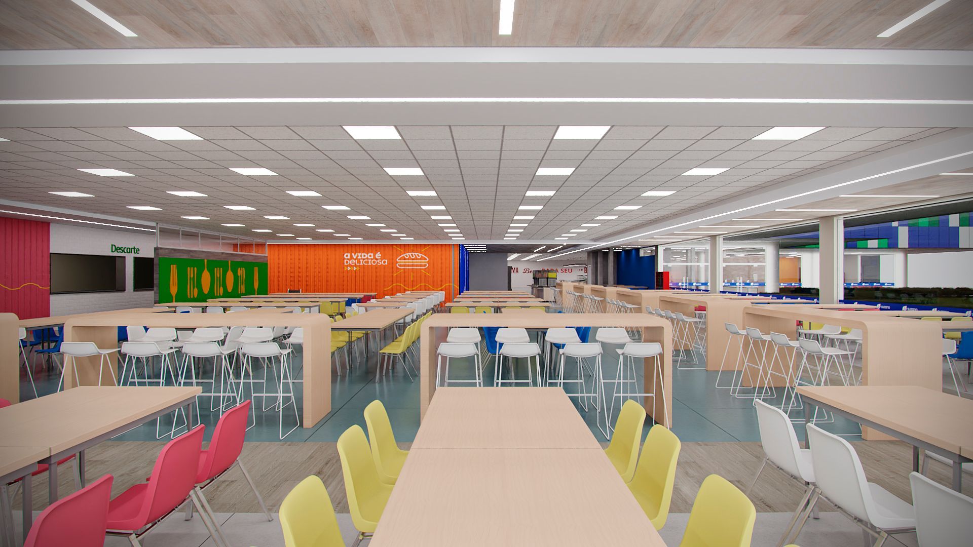 Projeto para o restaurante da unidade da Suzano em Mucuri- SP, contemplando novo layout funcional, troca de revestimentos, forro, iluminação e mobiliários.
