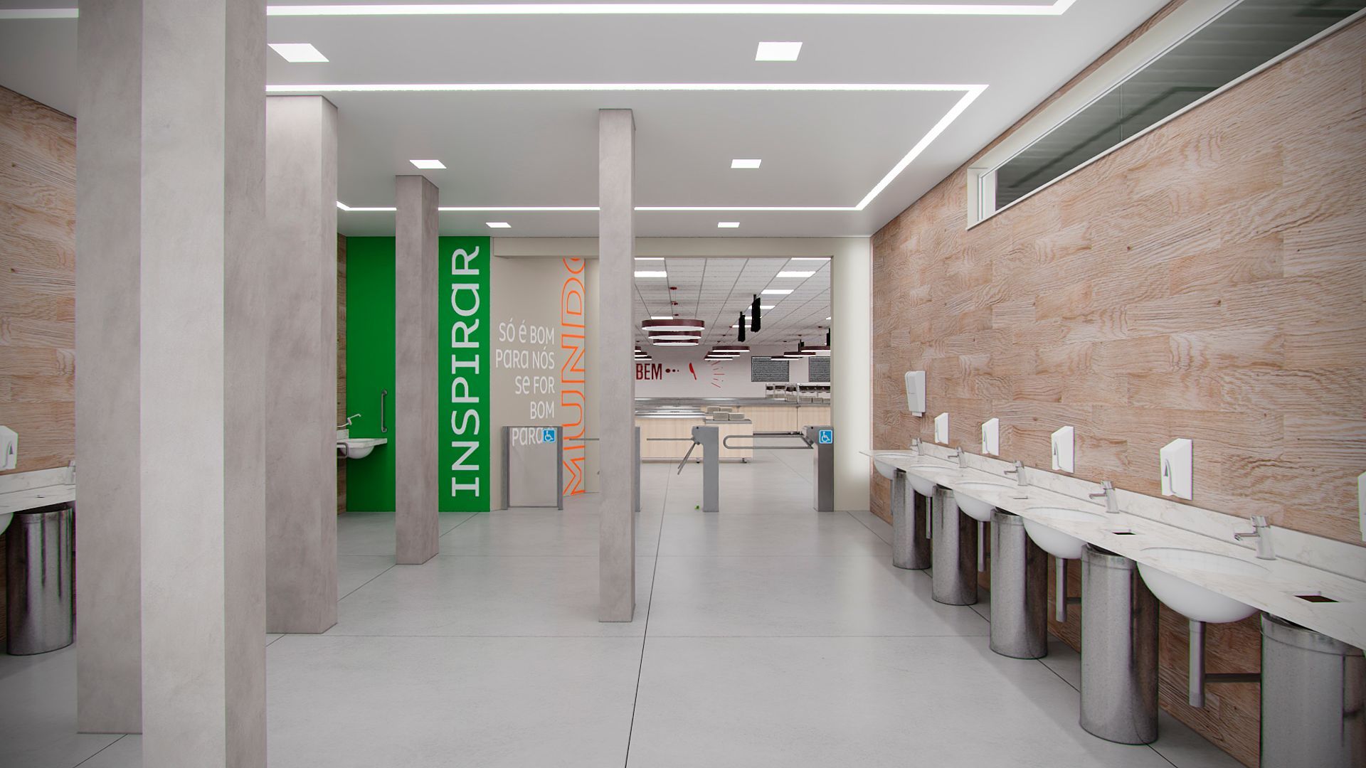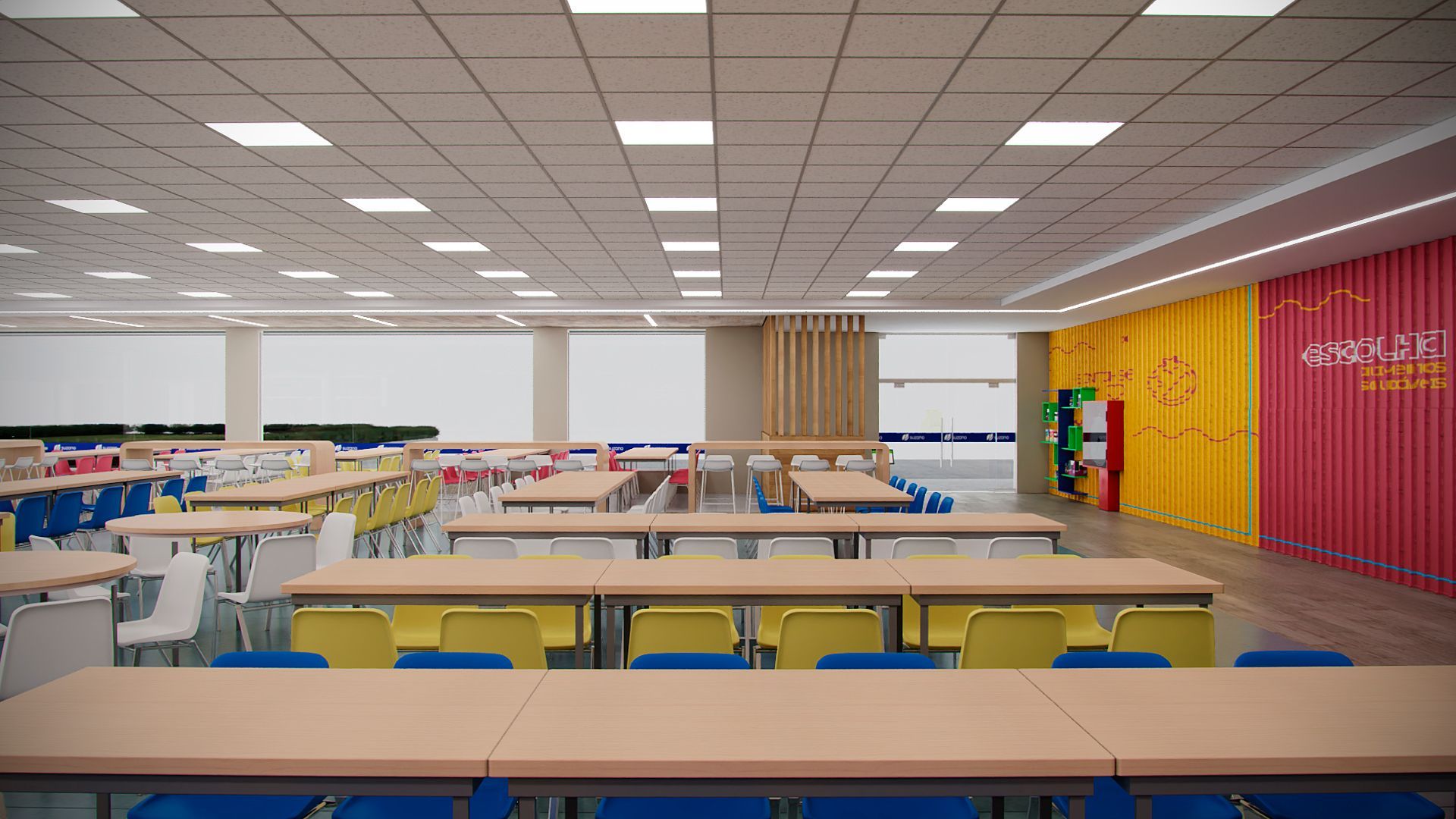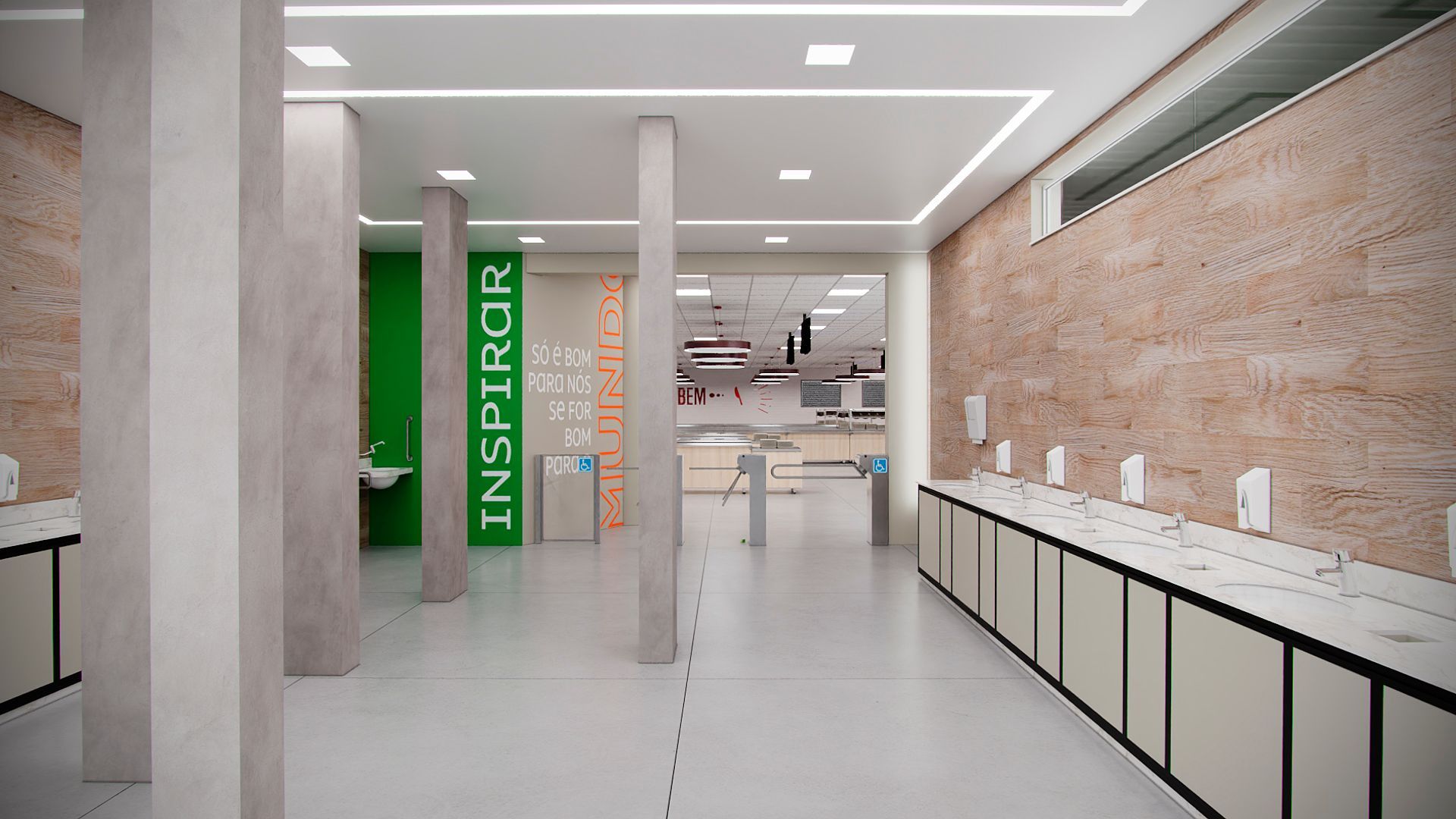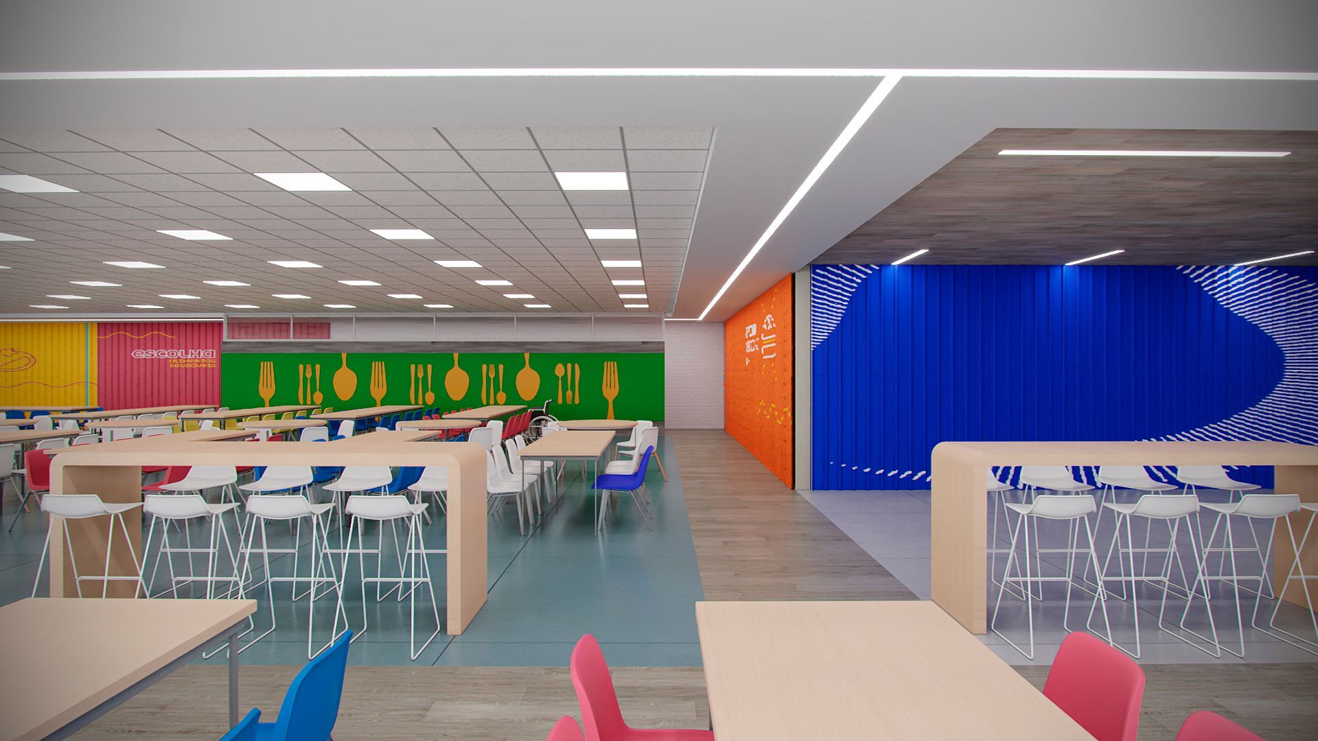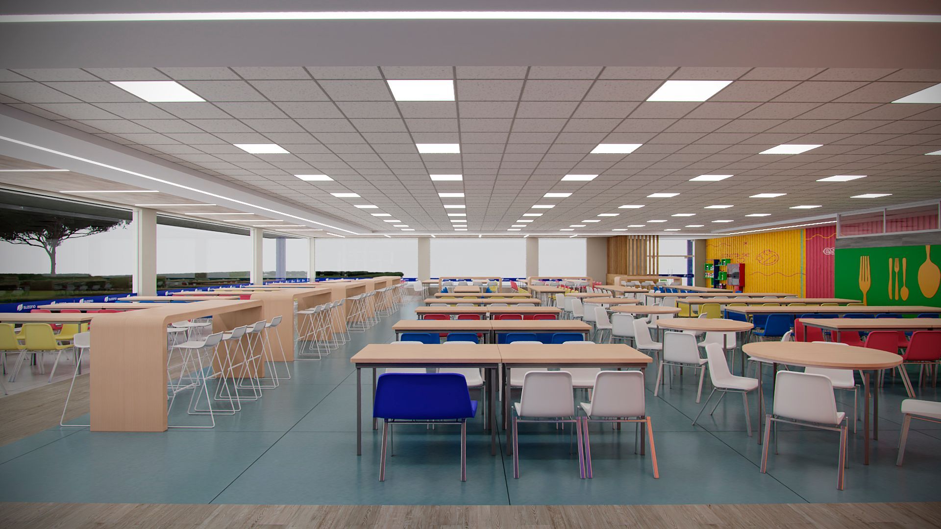 Projeto para o restaurante da unidade da Suzano em Mucuri- SP, contemplando novo layout funcional, troca de revestimentos, forro, iluminação e mobiliários.
