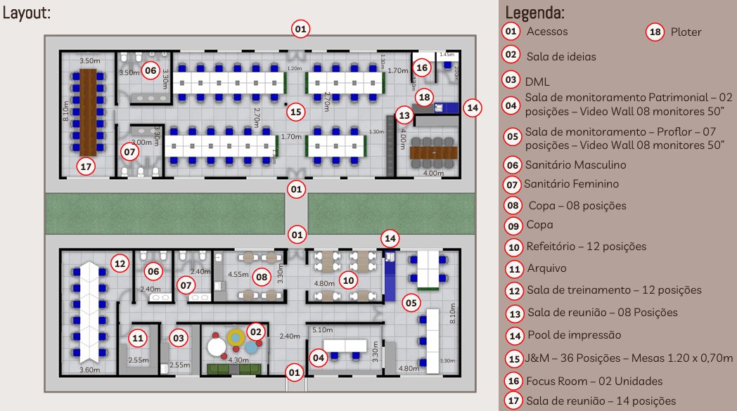 Projeto de revitalização dos prédios administrativos, adequando áreas de apoio como copa, reuniões e áreas de convívio no prédio 01 e mudança do layout para o conceito Juntos & Misturados Suzano no prédio 02.
